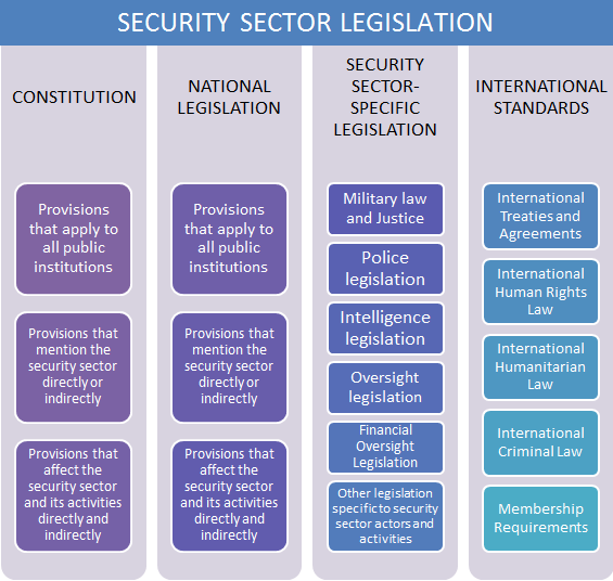 The most fundamental legislation concerning the security sector is contained in a country’s constitution, accompanied by a body of general national laws and regulations that comprehensively mention the security sector in a direct, or indirect, manner and apply to all public institutions of the state. There is also a set of security-sector-specific laws and norms that acknowledge the special needs and characteristics of the security sector and its agencies. The sum of these national laws, rules and regulations constitute national security sector legislation.
