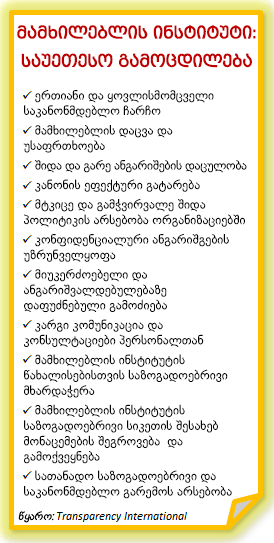• საზოგადოებრივი ცნობიერების ამაღლება მამხილებლის ინსტიტუტის სარგებლიანობის შესახებ.